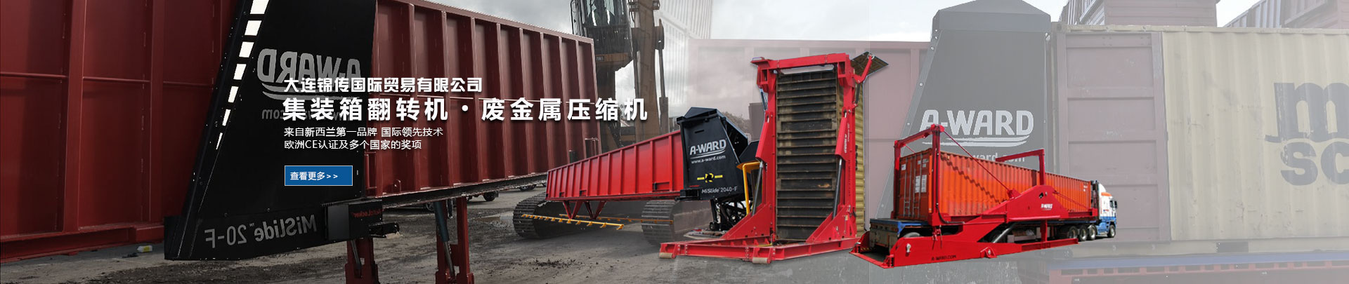 大連錦傳國際貿易有限公司于2013年11月與新西蘭A Ward公司達成戰略合作,成功代理集裝箱翻轉機、廢金屬壓縮機等產品在中國大陸的銷售、維護及保養業務。本公司重合同、守信用,保證產品質量,以經營多種特色的產品和薄利多銷的原則,贏得了廣大客戶的信任與厚愛?,F長期出口產品至澳大利亞,巴西,德國,俄羅斯,哥倫比亞,美國,泰國,羅馬尼亞,新西蘭 ,意大利,越南,印度,印度尼西亞等國家。